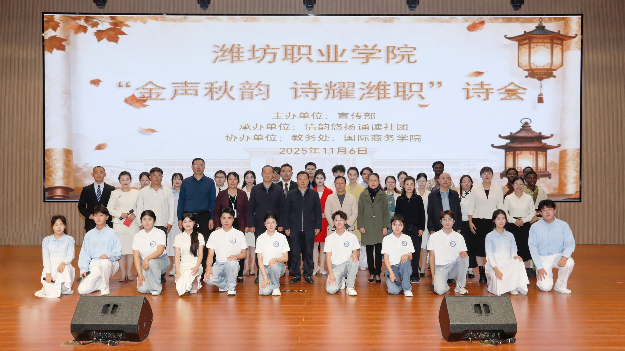为营造浓厚的书香校园氛围,传承中华优秀文化,厚植文化根基,增强师生民族文化认同感,11月6日,学院在滨海校区综合楼一楼西侧报告厅举办“金声秋韵 诗耀潍职”主题诗会。学院党委副书记贺志强,党委委员高凌云,党委委员、副院长赵宏坤,语委办主任刘泓蔚,党委委员、宣传部部长鞠桂芹及各部门党政负责人、师生代表齐聚一堂,共享文化盛宴。