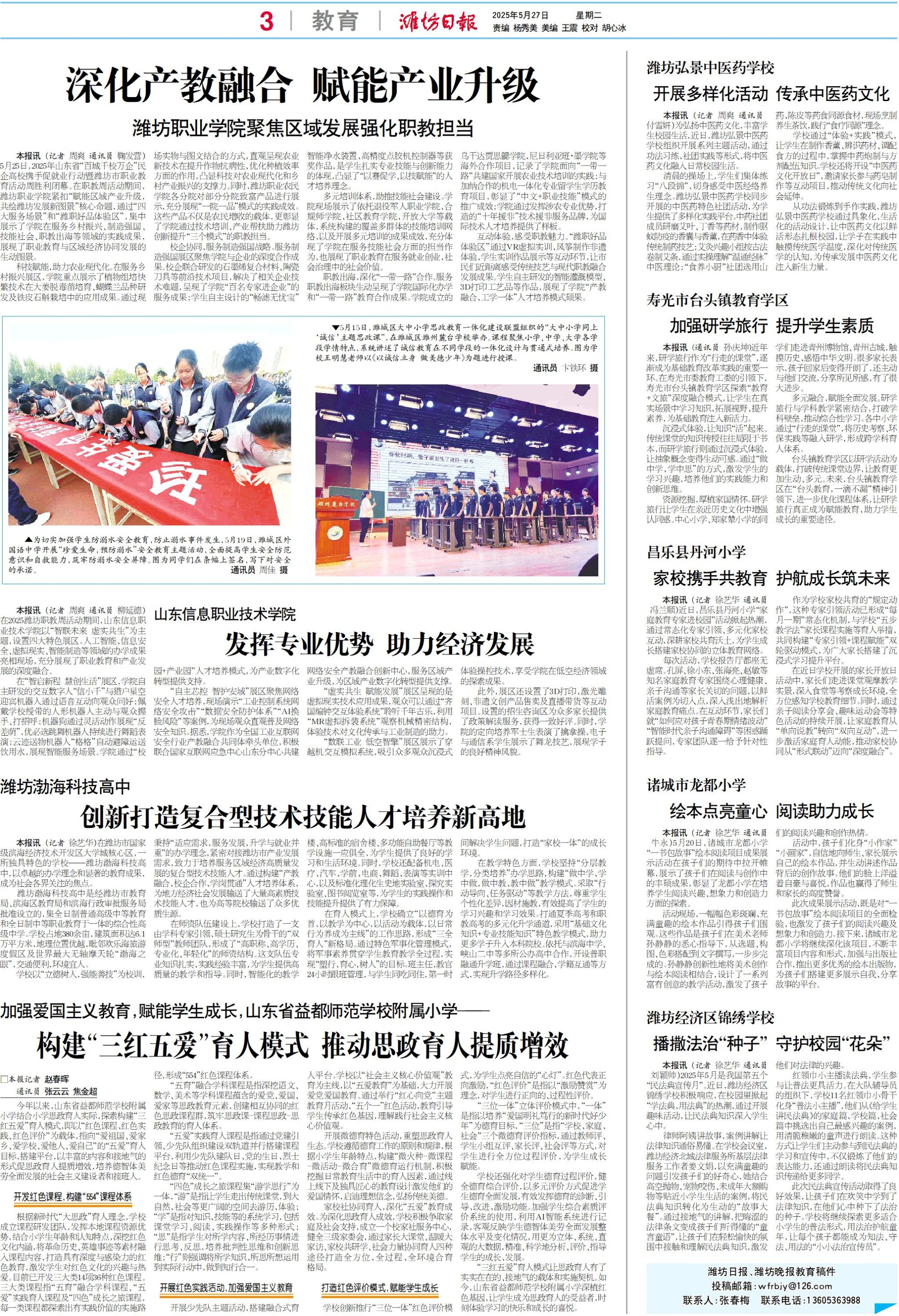 本报讯 (记者 周爽 通讯员 鞠发营)5月25日,2025年山东省“百城千校万企”民企高校携手促就业行动暨潍坊市职业教育活动周胜利闭幕。在职教周活动期间,潍坊职业学院紧扣“赋能区域产业升级,共绘潍坊发展新图景”核心命题,通过“四大服务场景”和“潍职好品体验区”,集中展示了学院在服务乡村振兴、制造强国、技能社会、职教出海等领域的实践成果,展现了职业教育与区域经济协同发展的生动图景。